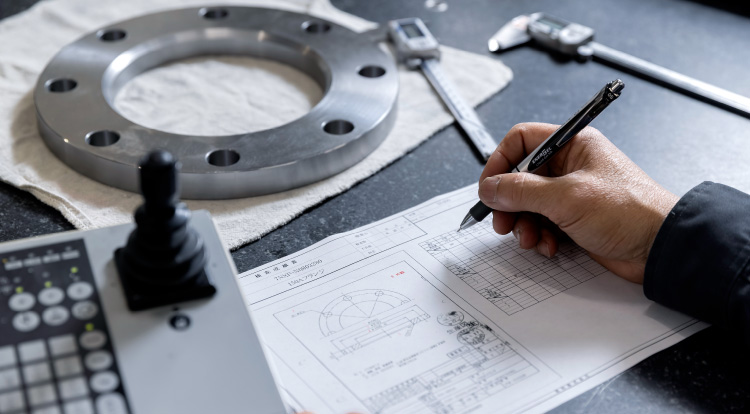 製品の図面が完成したら、後は崇和にお任せください。当社では、鉄、アルミ、ステンレスといったよく使われる素材はもちろん、チタンやインコネルといった合金の調達に幅広く対応。機械加工、溶接、表面処理、品質検査まで一貫した生産体制によるワンストップサービスを実現しています。